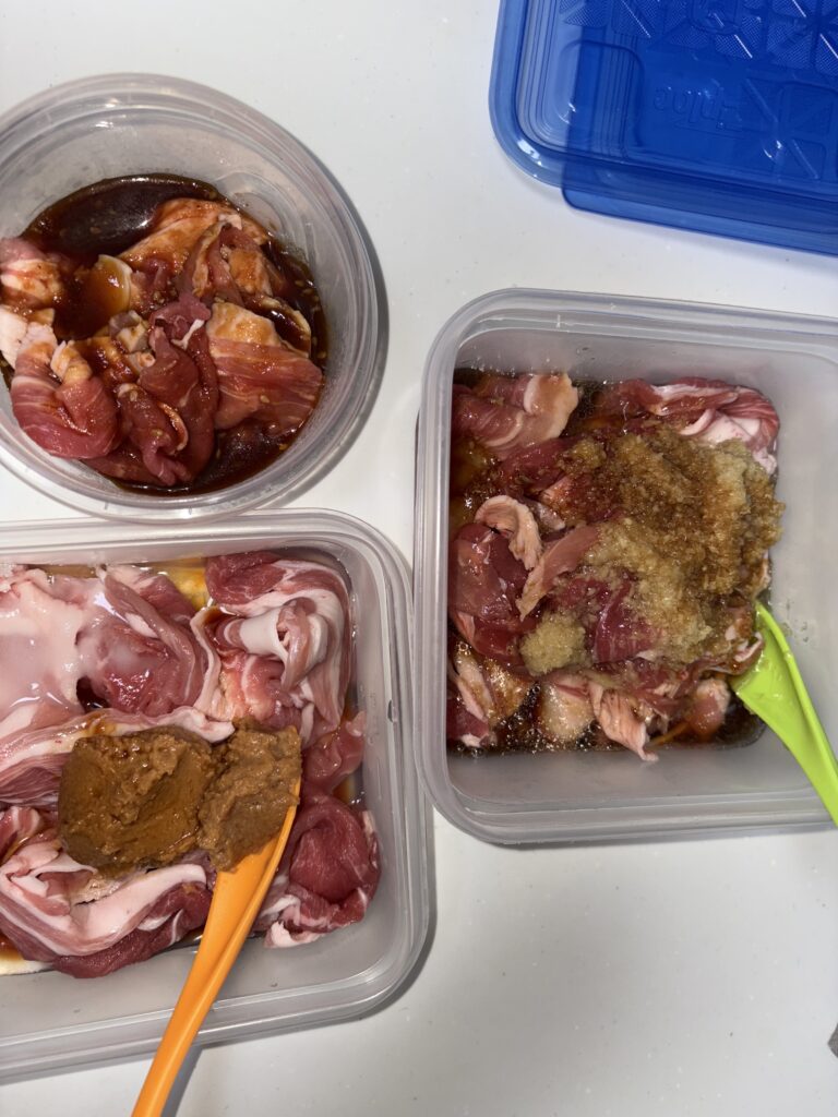 左下は中で約250gほど、多めの野菜と炒めていい感じになるよう味濃いめの味噌漬けにします。