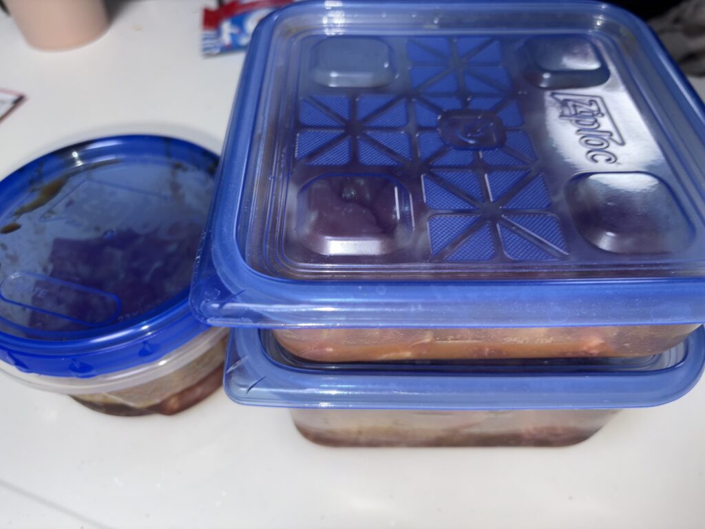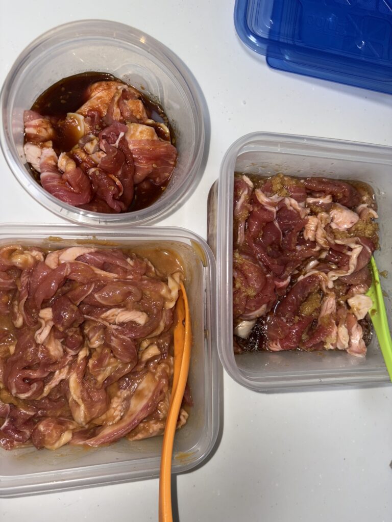 左上の丸容器は小で約150gほど、お弁当用に焼き肉のタレ味にします。