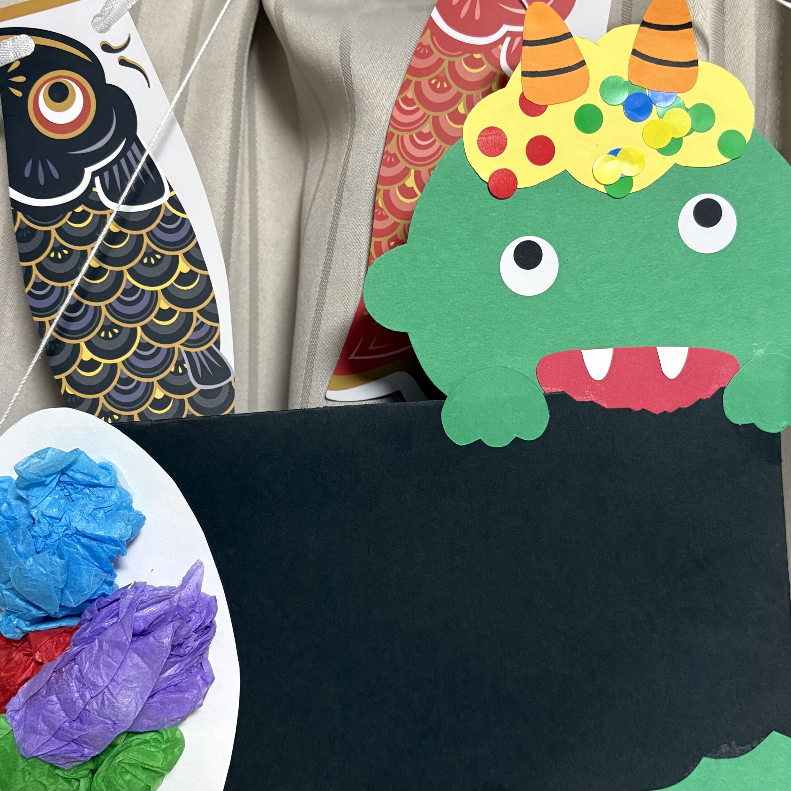 画用紙で作ったみどりのおにと、赤や青のティッシュが具材になったカラフルな恵方巻きだ。