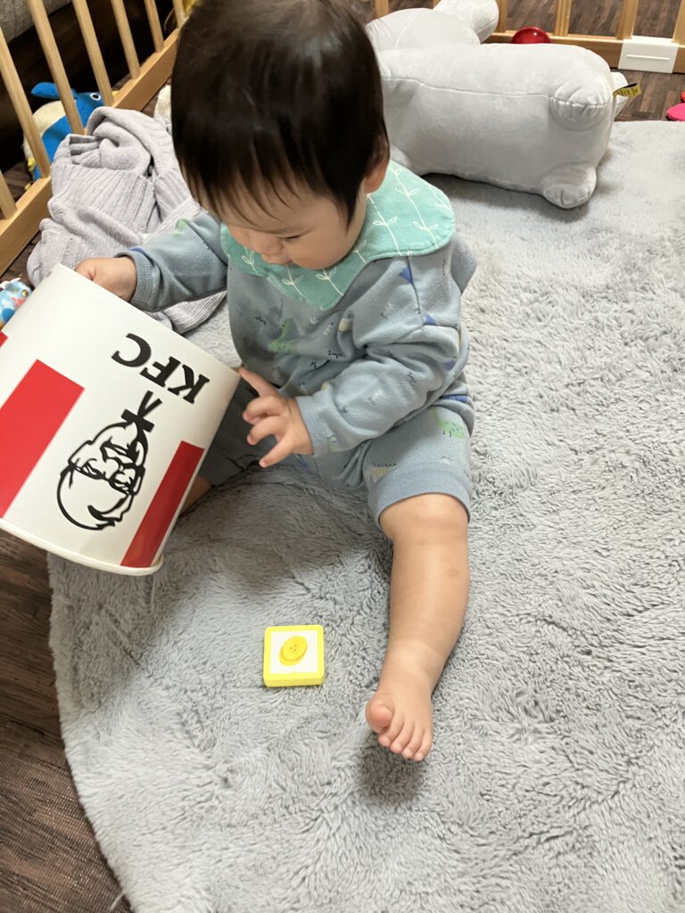 ひっくり返して太鼓のおもちゃにしていました。
